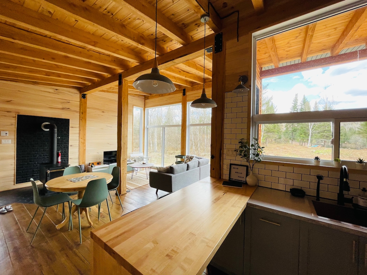 Welcome to La Khabine! This cozy, modern cabin comes with all you need to relax and connect with nature. Enjoy a glass of wine with the sound of a crackling fire in the wood burning fireplace. Take in the view of the forest through the surrounding floor to ceiling windows. Relax in the private outdoor cedar barrel sauna. Natural self-care products, firewood, laundry soap, and high-speed Wi-Fi are all complimentary. We hope you'll love our little cabin of windows as much as we do :)