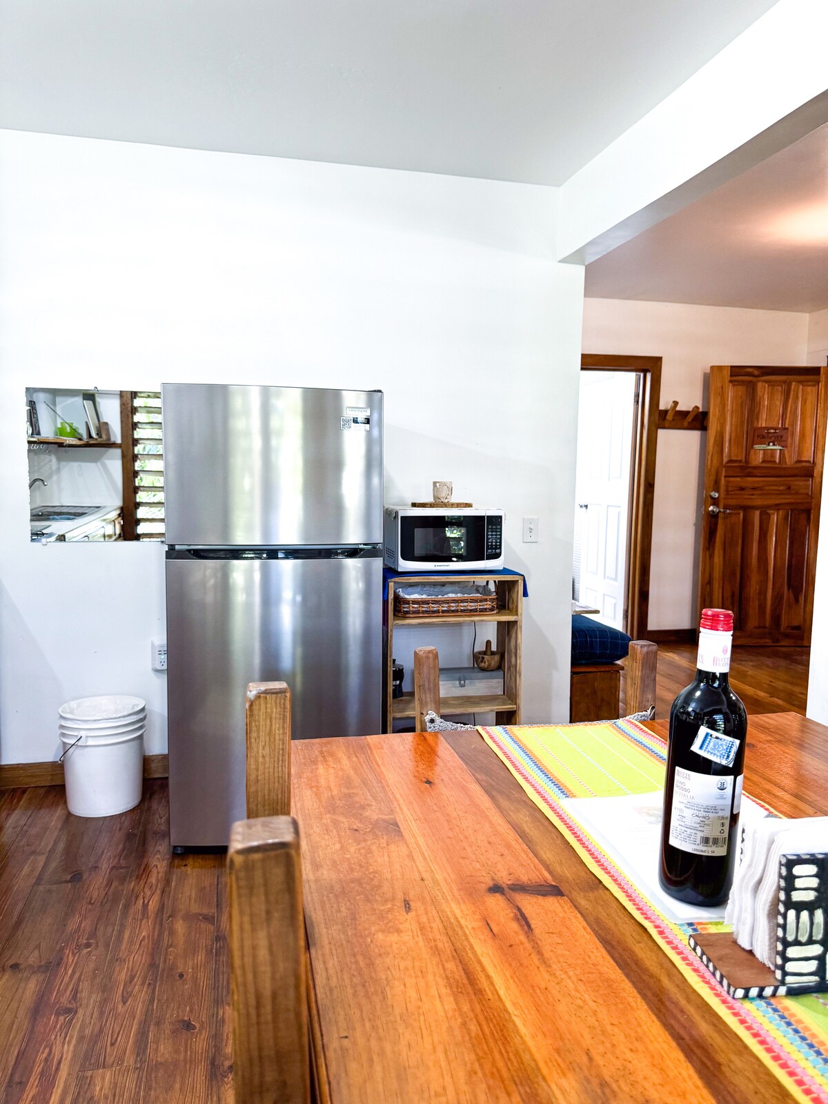 Forget your worries in this tranquil and serene place. This is 2nd brand new wooden house on our beach property with Ocean view, it's 2 store house, downstairs is kitchen with living room area and half bathroom, upstairas is bedroom with full bathroom and porch with hammock. It's on private beach, with Ocean view and access to the dock to snorkel and relax