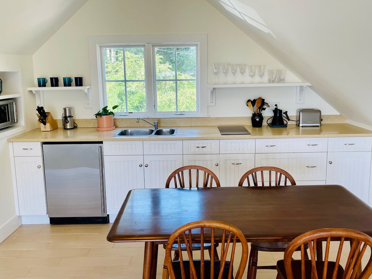 Open concept small studio, private patio and entrance, full kitchen. *SHARED wall between studio and main house, therefore some shared noise. 2 minute walk to the ocean , Lobster and Blues Festivals. A small swimming beach is a 5 minute walK, 5-10 minutes to the Farnsworth and CMCA museums, Strand Theater, restaurants, antiques shops & galleries. ALSO NOTE we do not have television. We have wifi but you must bring your own device . EXEMPT FROM ACCEPTING SERVICE DOG
