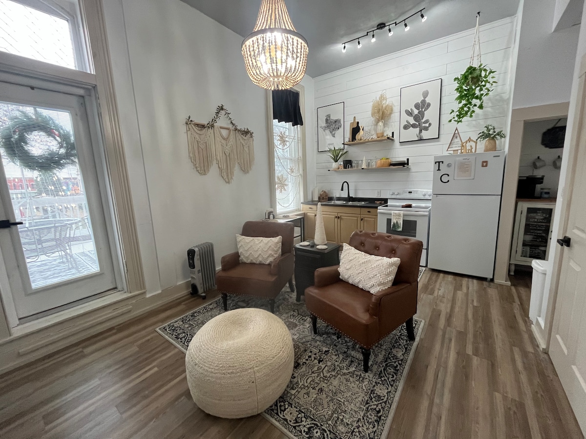 Welcome to your perfect getaway at Parke Hotel in the heart of Rockville, IN! This charming one-bedroom apartment, styled with boho decor, offers a warm and inviting ambiance for your stay. The living area is thoughtfully decorated, creating a cozy atmosphere that feels like home. Step out onto your private balcony and be captivated by the stunning view of the beautiful courthouse. This scenic spot is ideal for enjoying your morning coffee or winding down in the evening. Book your stay today!