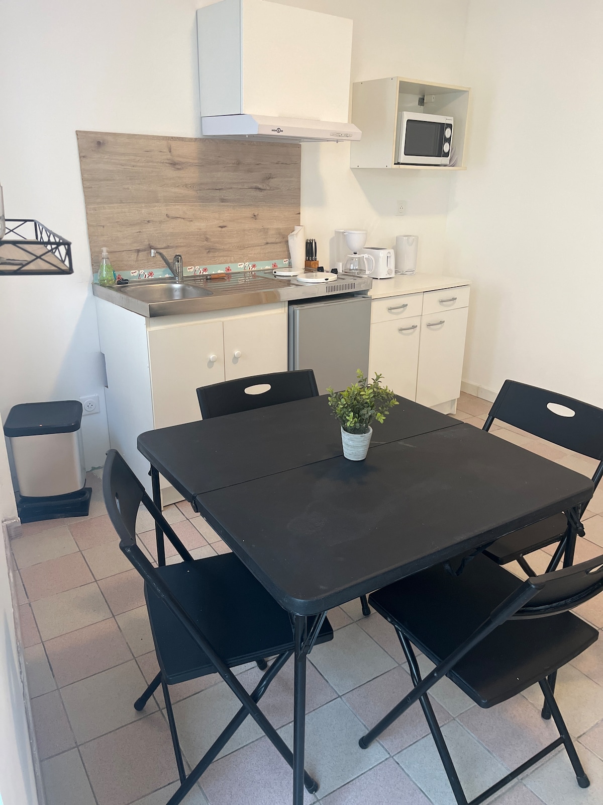 Studio de 19m2 se composant d'un espace nuit avec un lit confortable et une TV ,d'un espace repas avec un micro-ondes,d'une bouilloire,de la vaisselle ,un frigo,puis une douche à l'italienne ,wc.unventilateur. Parking gratuit devant la Résidence,Il n y a pas de fenêtre...une seule dans la salle de bain....mais une porte vitree que vous pouvez laisser ouverte l 'ete car elle donne sur le jardin. Draps,torchons et serviettes non fournis.Pas de plaque de cuisson mais un micro ondes.Pas de wifi