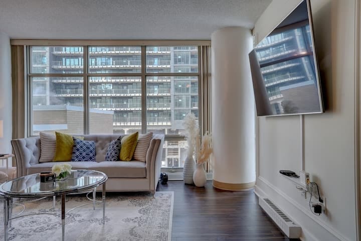 Stay in the heart of Downtown Toronto’s Entertainment District and enjoy luxurious urban living with no need to drive. This spacious one-bedroom plus den condo offers stunning views of the CN Tower and Lake Ontario, all from a modern high-rise suite. With a fully equipped kitchen, high-speed WiFi, a 65-inch Smart TV with free Netflix, and a private balcony overlooking the city, it's the ideal space for tourists, families, and business travelers looking to explore everything Toronto has to offer.