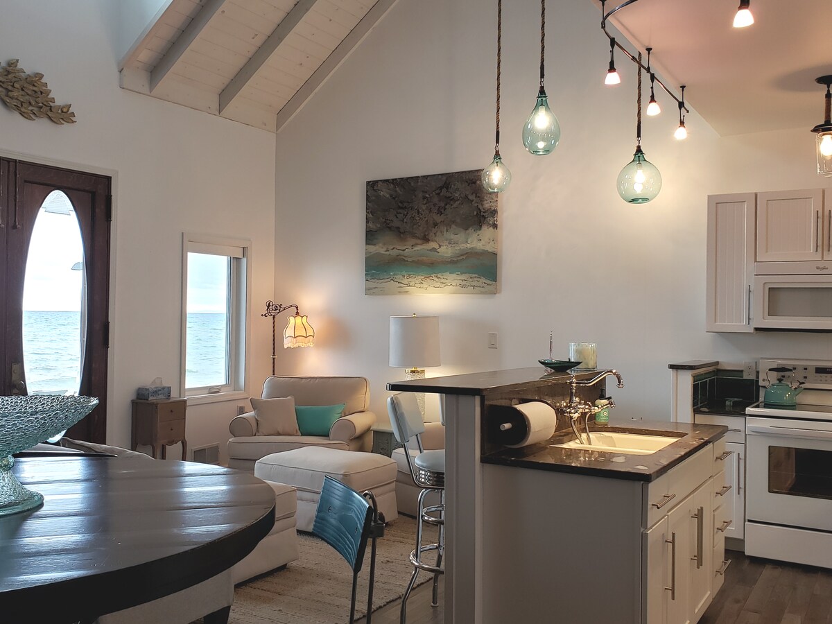 LAKEFRONT: Historic Stonecliffe Cottage offers you all the outdoor pleasures of an Up North get-away in a lakefront setting. Wake to a gorgeous Lake Huron sunrise, and scan the unobstructed horizon as far as the eye can see. Walk the sand beach, swim, watch Great Lakes freighters, bike the Huron Sunrise Trail, & explore nearby lighthouses. As sunset approaches, hear the loons call & watch the starry night skies. Let the lapping waves lull you to sleep.