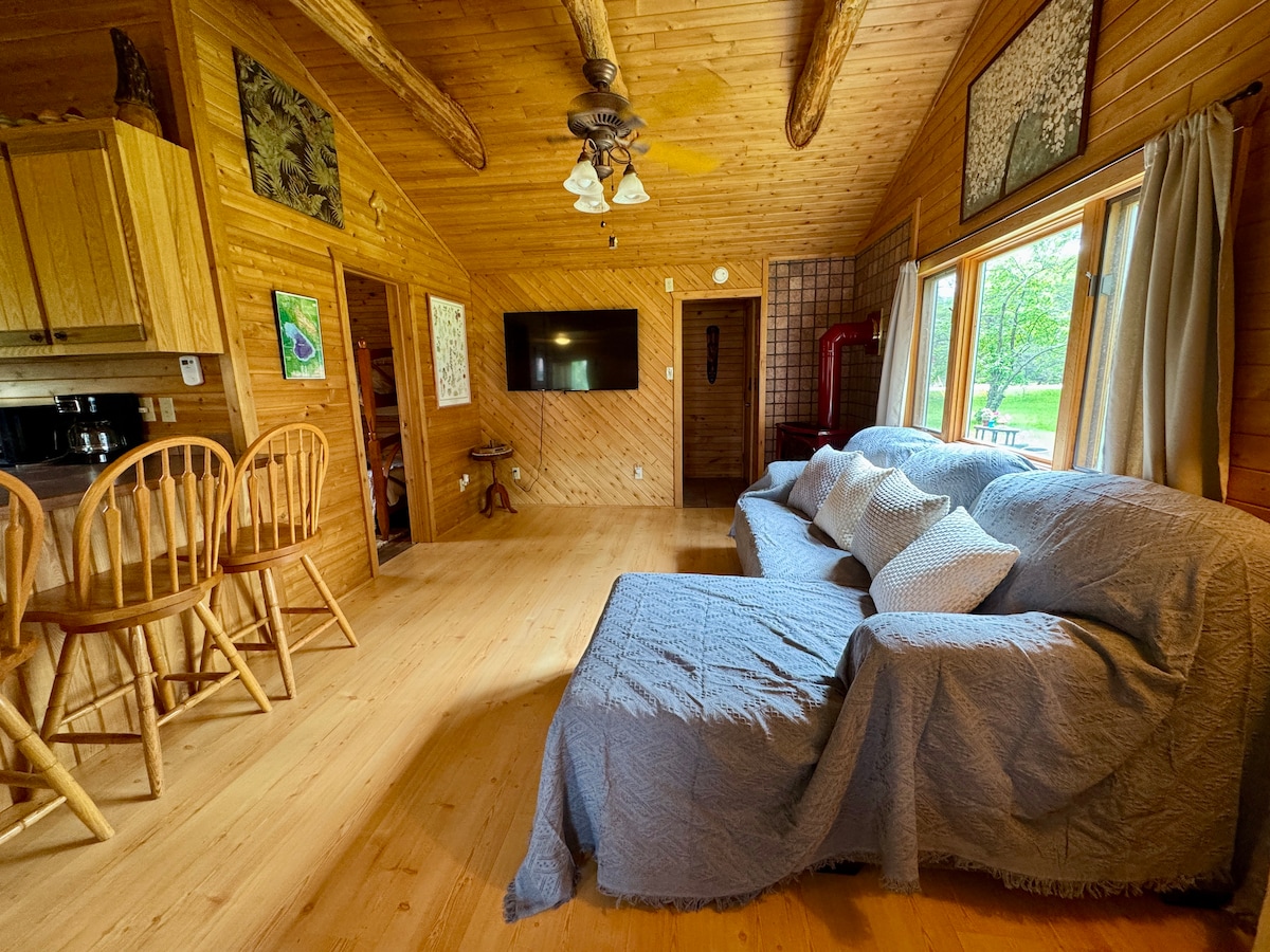 We have just added an outdoor sauna to this fabulous cabin in the woods behind our house. Although there is only 1 proper bedroom there is a sleeping loft with a queen size bed and window overlooking the hardwood forest. We also have a pull-out couch. Guests have complete privacy and everything provided for a comfortable stay This is a cabin with peaceful relaxation in mind....no loud parties or anything of that nature. Come and enjoy northern Michigan's beauty in all seasons.