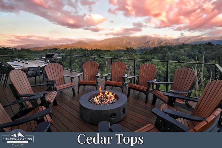 Cedar Tops is a luxury cabin in Chalet Village North, just minutes from Downtown Gatlinburg and Pigeon Forge, offering breathtaking 180-degree views of Mt. LeConte and the Smoky Mountains. The cabin features high ceilings, grand windows, and a spacious game room with pool, air hockey, and foosball. Cozy up by the gas fireplace or test your culinary skills in the fully stocked kitchen with a gas grill on the deck. After a day of adventure, relax in the hot tub or enjoy the stunning mountain starscape. The cabin also includes a nursery for the little ones, free Wi-Fi, premium cable TV, and all the amenities for a perfect retreat.