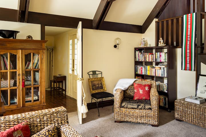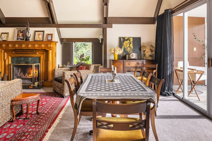 Attached to the Main House is the gem of the property—The Coach House. This quaint and cozy fully-equipped ensuite is most suited for couples looking for a weekend getaway or solo travellers looking to get to know Wairarapa locals and explore the region. Filled with eclectic art and treasures collected locally and from around the world, this unique space offers everything you need to enjoy a tranquil getaway: luxurious canopy king-size bed, fully-equipped kitchen, living and dining room, open fireplace, and private access to the swimming pool and gardens.