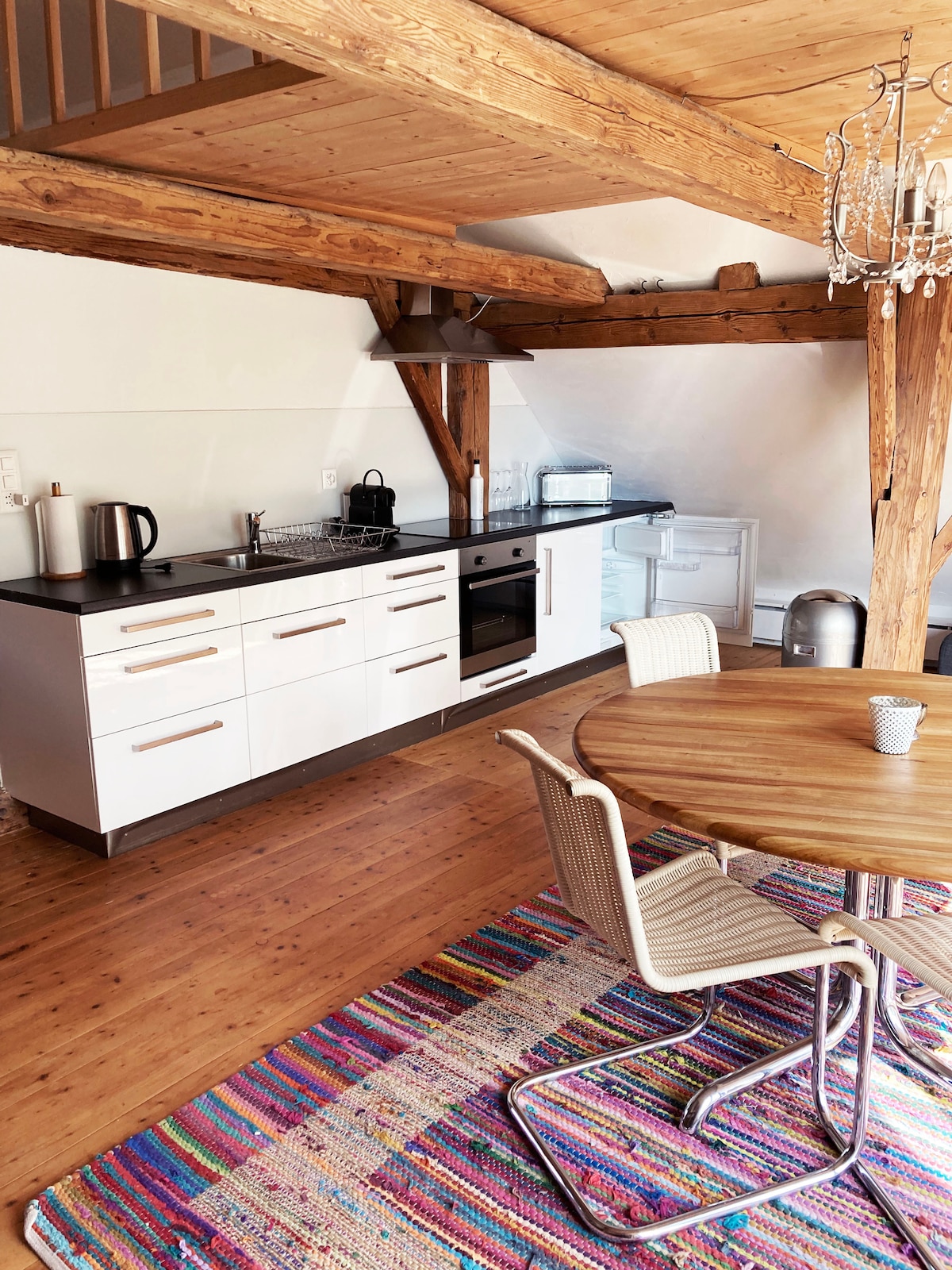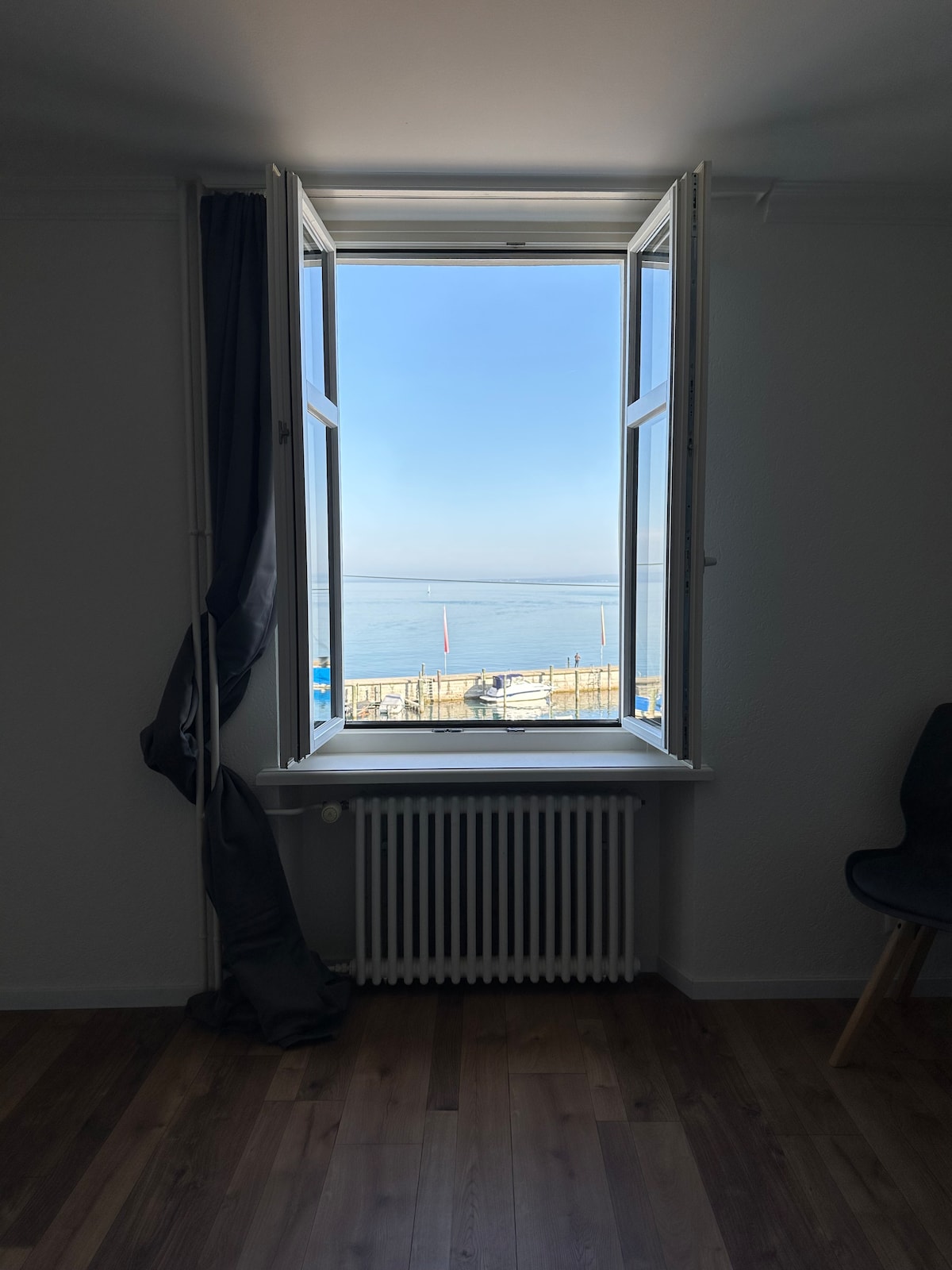 Large, bright, cozy, newly furnished, renovated 4-room apartment (120 m2) in a central location in a historic old town building in Rorschach. The apartment offers space to enjoy. Parts, such as the bay window in the living room, give the apartment a special charm. This is also underlined by simple furnishings.