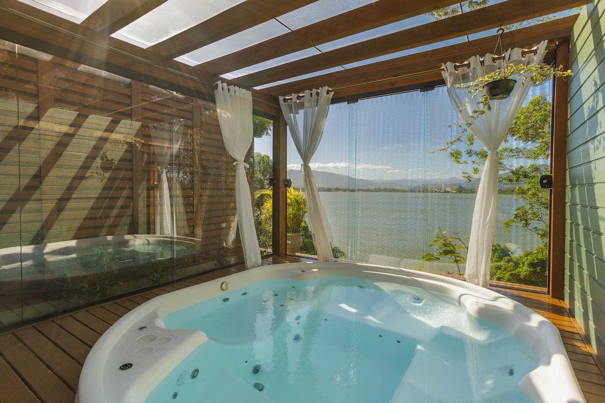 Enjoy the EXCLUSIVE AND PRIVATE refuge with HEATED ofuro, in the middle of a forest with spectacular VIEWS of the sunset at Lagoa Encantada. The en-suites feature air-conditioning, TV and 600MB Wi-Fi Heated and hydromassage ofuro. Full Gourmet Space Kiosk. There are two en-suites, one with a double bed and the other with two double beds, we do not rent separately. Close to the beach and the city center. Access to the beach by trail or exclusive staircase, a beautiful exercise for the body and soul.