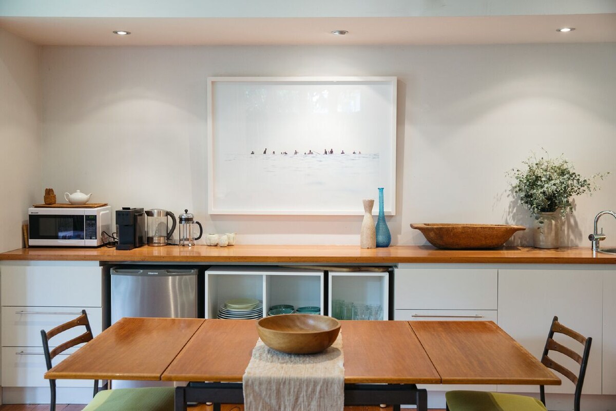 Tucked away on a peaceful street, our chic apartment is a retreat moments from the area's best coffee shops and 15-min walk to iconic Bondi Beach Enjoy the homely charm of our ground floor art deco haven boasting garden access. While the apartment naturally stays cool, we've got fans on standby. There's a queen bed, a double bed in the study and an air mattress that fits in the living room. Comfortable stay for 2, but have had 3 and 4. Well trained pets welcomed
