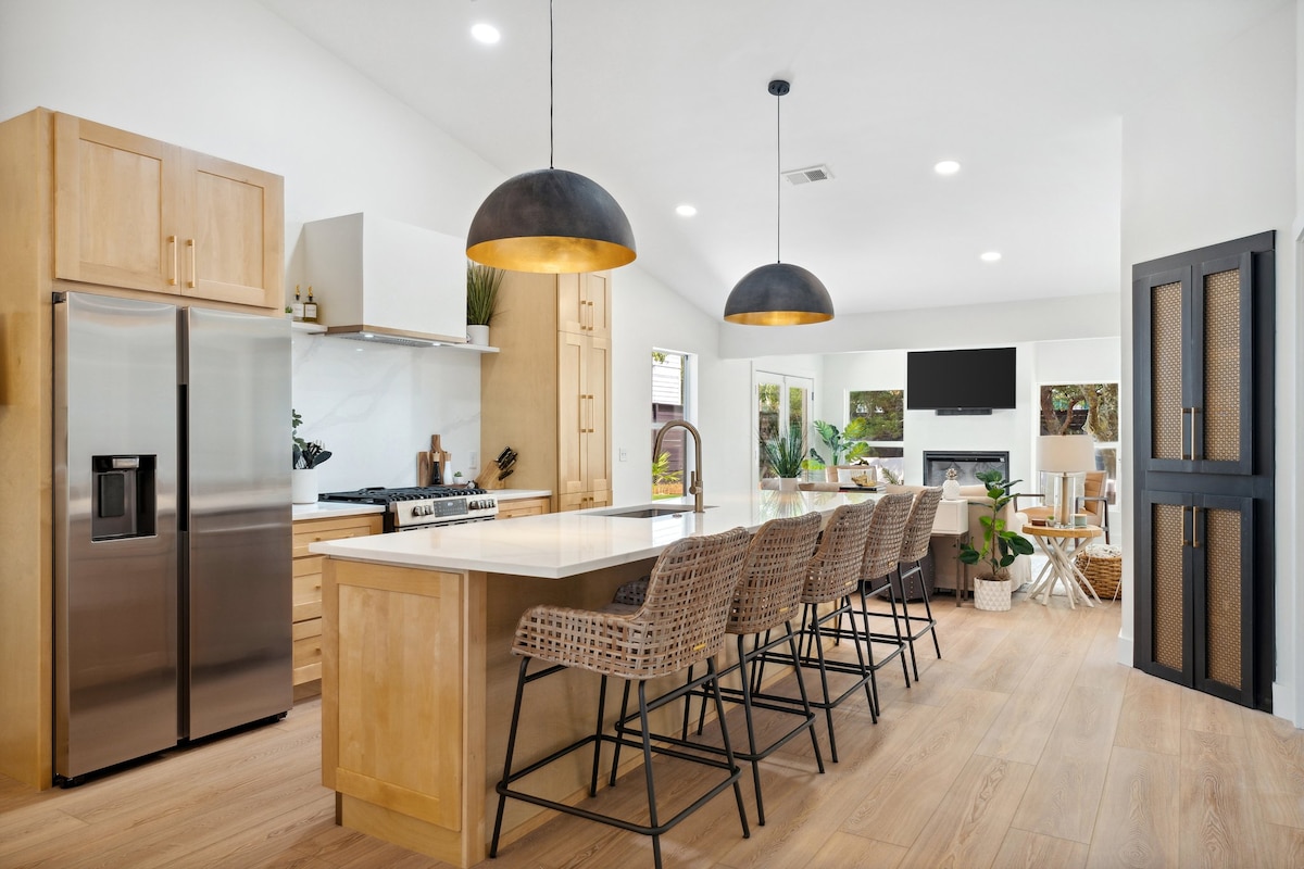 Brand New Heated Pool & all new interior renovation is stunning! Rare Private Beach-easy walk (1 block).. Kid’s Bunk-n-play room -65” Smart and Ping Pong Table. Newly renovated “Lux Bungalow” is designed for big family entertaining inside and out or cozy adult time poolside or by 2 fireplaces! 3 brms/2.5 baths-sleeps 10! NOTE: For pool, an additional heated daily rate of $45/Day-ONLY for stays Oct- March! NO CONSTRUCTION NEXT DOOR! ALL DONE