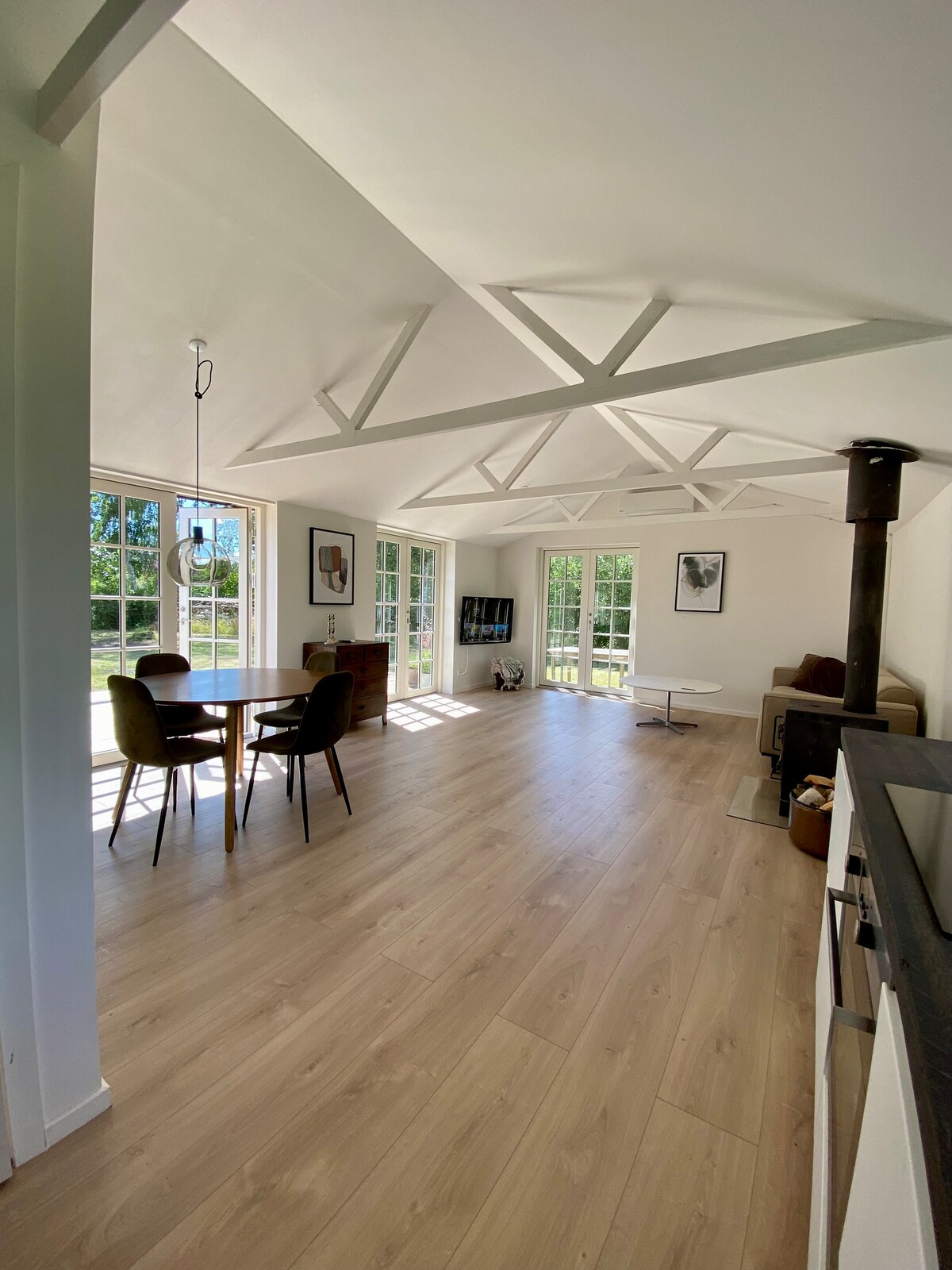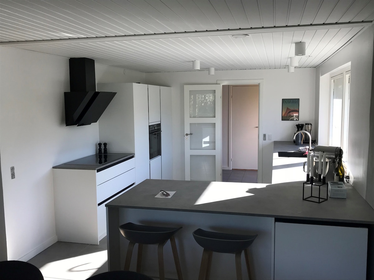 This home is located on a large, undeveloped plot in a quiet neighborhood close to the water, a short distance from the beautiful Roskilde Fjord. You'll love this place because of the natural light, the modern decor, the high ceilings, and the cozy atmosphere. The house is close to the charming town of Roskilde and right by Roskilde Fjord, with only a 30-minute drive to the center of Copenhagen. It's the perfect home for couples, business travelers, and families with children. It is a private home with a personal touch