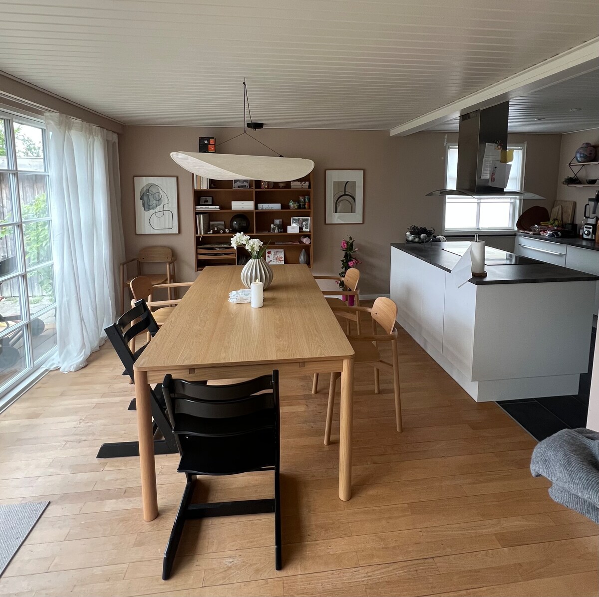 Tag hele familien med til vores skønne, hyggelige hjem med god plads til afslapning, nærvær og sjov. Grill et lækkert måltid på terrassen mens I nyder udsigten over marken (måske kommer de 3 lokale storke forbi) eller tilbered det i det store veludstyret køkken. Når aftenroen sænker sig, kan I tænde hybridpejsen og streame en film på tv’et eller spille et af vores mange sjove brætspil. Roskilde by, vikingskibsmuseummet og Vigen strandpark ligger 10-12 min. væk i bil og er bestemt et besøg værd.