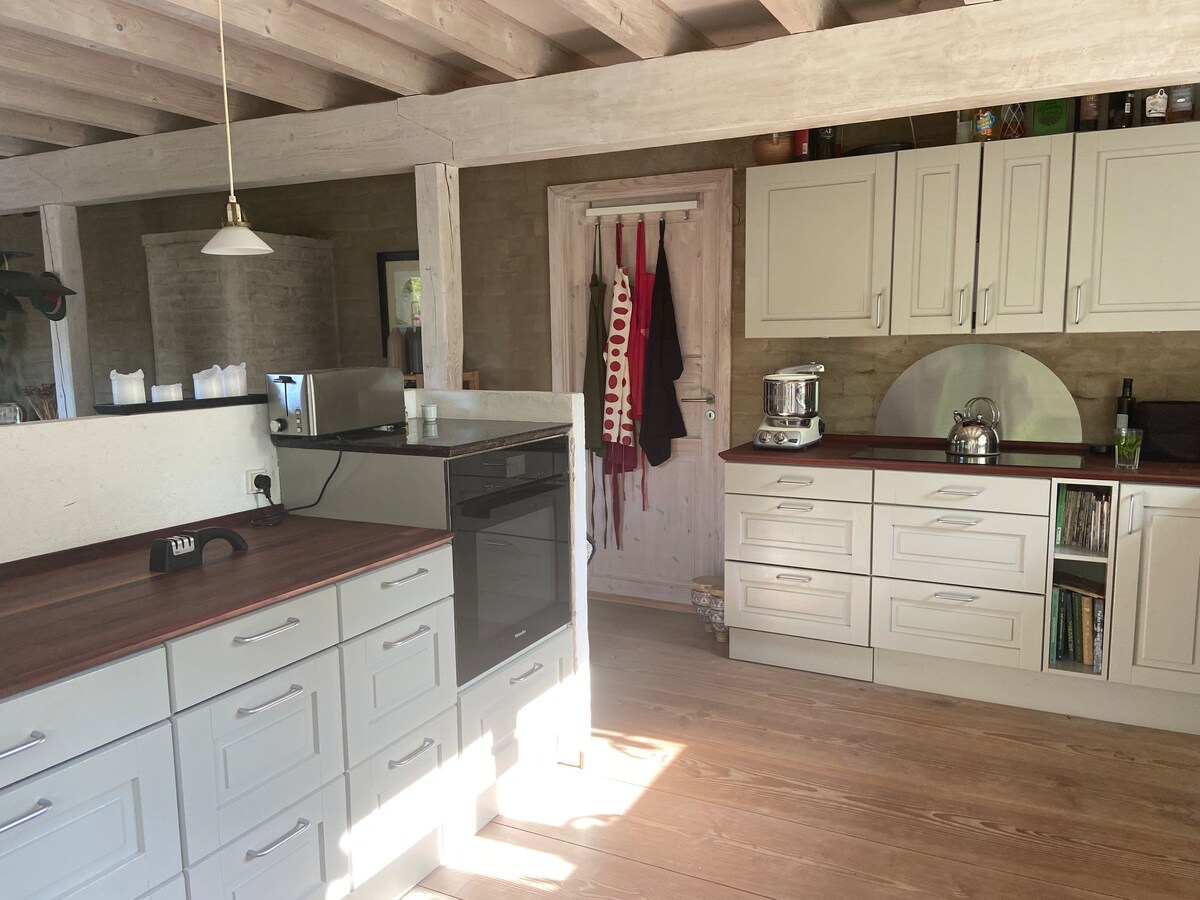 Experience the idyllic farm life at Kastholm! Spacious 140 m2 apartment with private garden and view of the Værbro Ådal. Ideal for families. Bedroom with double bed, as well as 2 beds (90x200) and a sofa bed (160x200 cm) on the first floor. Bathroom with walk in shower, separate toilet. TV with Chromecast. Close to train station and only 26 km from Copenhagen. Enjoy nature outside and meet our animals - horses, pigs, cows and hens. Book now for a unique vacation experience!