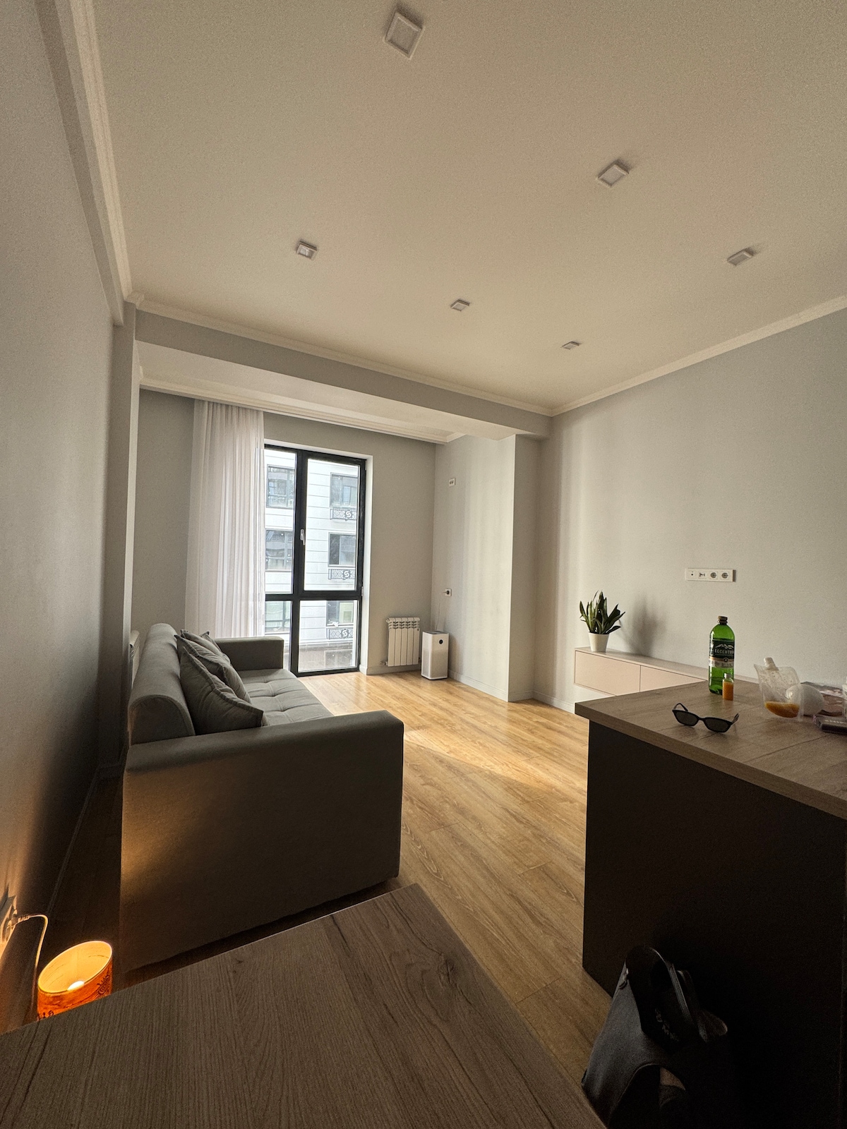 • Restful Sleep: A dedicated bedroom featuring a stylish fluted headboard and blackout-capable curtains for those lazy Sunday mornings. • Fully Equipped: Includes a functional kitchen area with a dining peninsula, an air purifier for fresh indoor air, and plenty of storage. • Prime Natural Light: Large windows offer views of the neighborhood while keeping the apartment feeling bright and energizing throughout