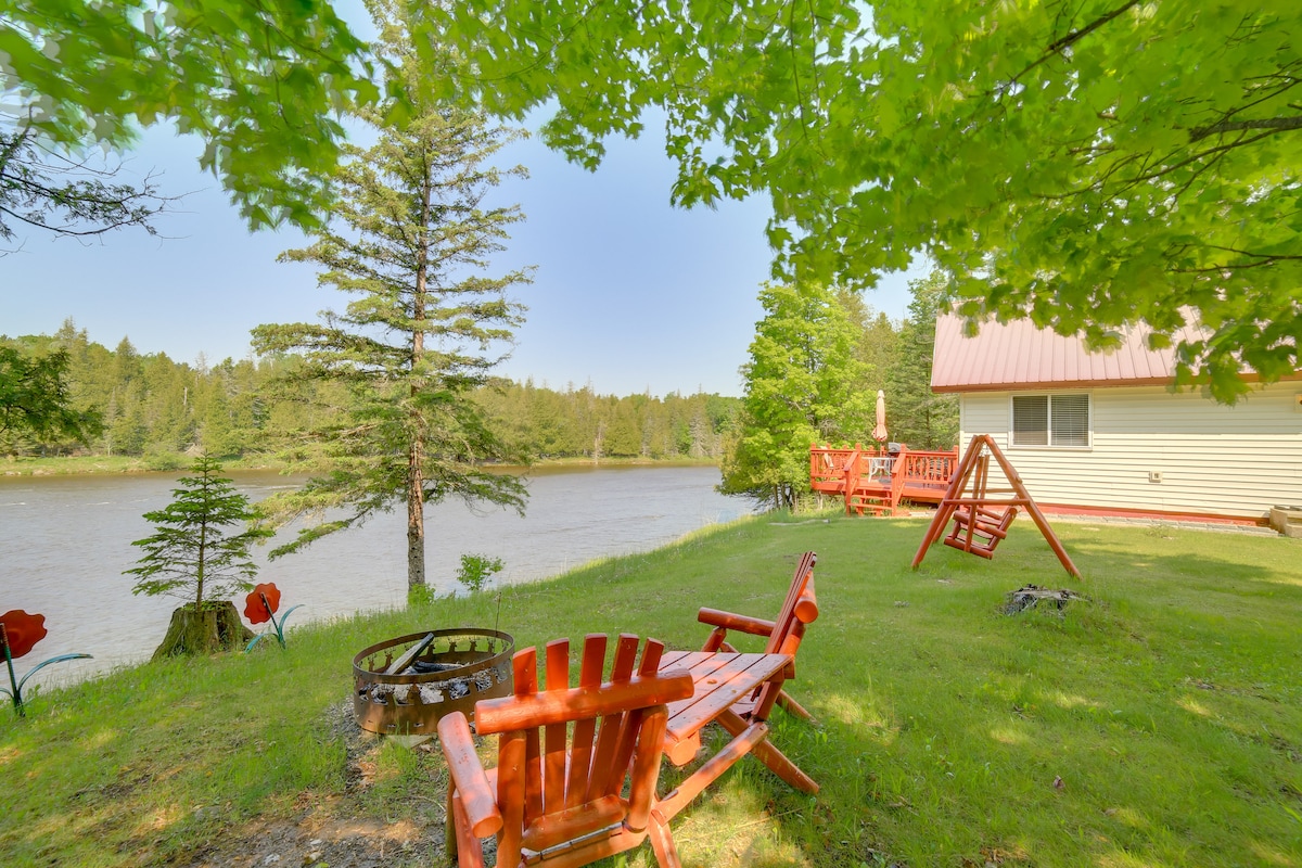 Year-round fun: Snowmobiling, skiing, ice climbing in winter; fishing and bird watching in spring; swimming, boating, hiking and kayaking in summer; and color tours and hunting in the fall! Beautiful and spacious 3 BR cottage - impeccably maintained & tastefully decorated. Tongue and groove walls and ceiling throughout. Large stone natural gas fireplace centers an open concept living area with a vaulted ceiling and split-log staircase leading to a loft. Tranquil 180-degree riverfront views!