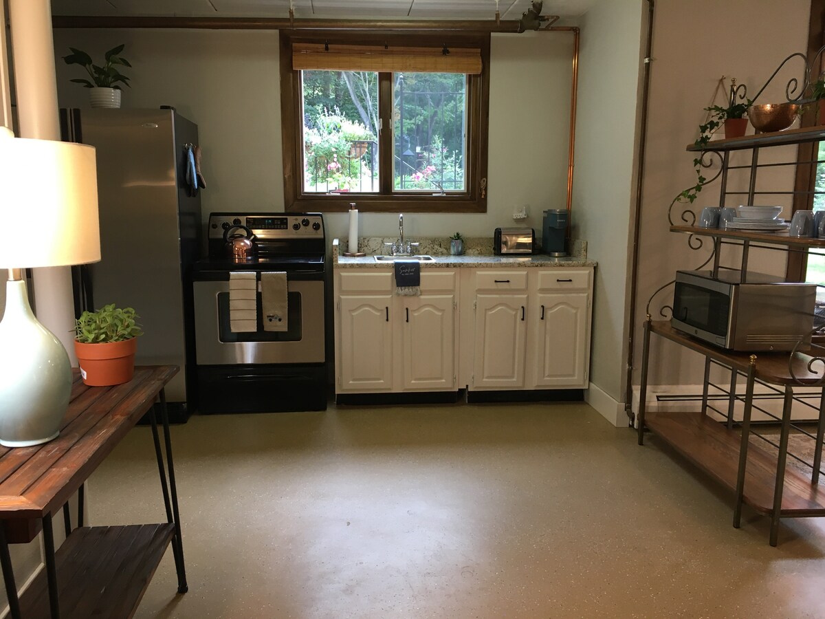Sweet cottage on our farm: Fully equipped kitchen and furnished living/sleeping area 14’x15' approx., washer/dryer. Sleeps 4: queen bed and queen sofa bed. Lots of privacy and next to organic garden, fields, stable and fruit orchards. All utilities, TV and WI-FI included. Well water with new water softener and water heater. Pet friendly; no pet fee. Lots of farm paths to walk your pet. Encourage off leash if trained. Horses have moved to another farm while pasture and stable rehabbed.