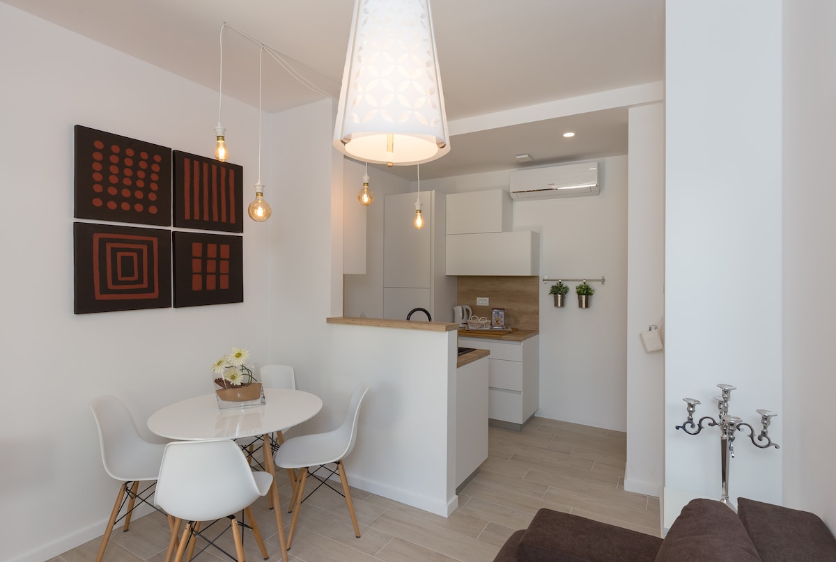 Brand new one bedroom apartment in downtown Dubrovnik with a private terrace. Supermarkets, malls, restaurants, bars and bus stop few minutes away by foot. 20 mins by foot to get to the Old Town Dubrovnik or minute away with a bus. The apartment has an elevator, so there are no stairs to reach it. The closest beach is 10 minutes away by foot. The apartment has a private parking space in the garage
