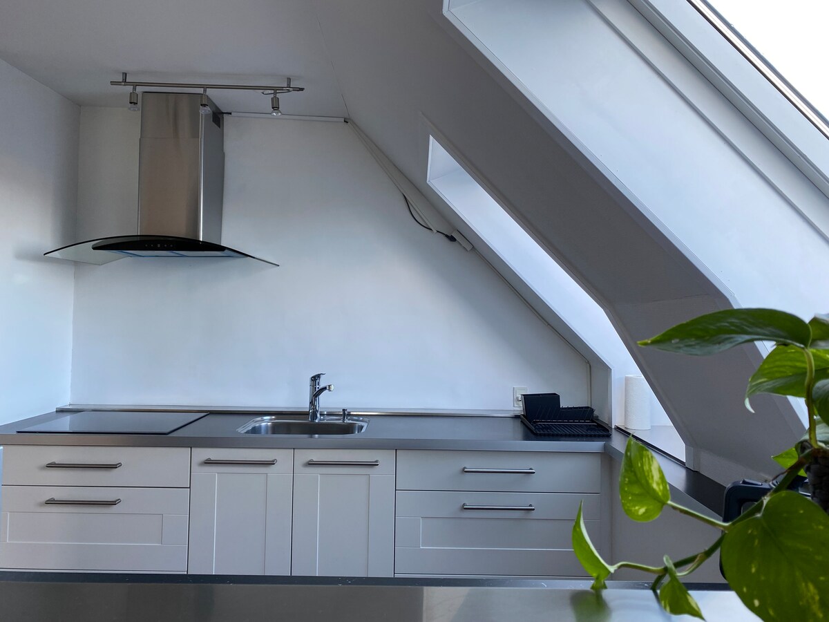 Right by the forest and public transport is this amazing townhouse. The house is historic from 1892 with two terraces, and inside everything is modernly decorated. I live in the house myself. The ground floor has an entrance, a well-equipped kitchen and a large living room. Your room is on the first floor with cozy sloping walls. The bed is a sofa bed 140x200cm with a hard mattress. Bathroom with shower and washing machine is on the 1st floor and shared with me. The location is ideal between Copenhagen and the Royal North Zealand.