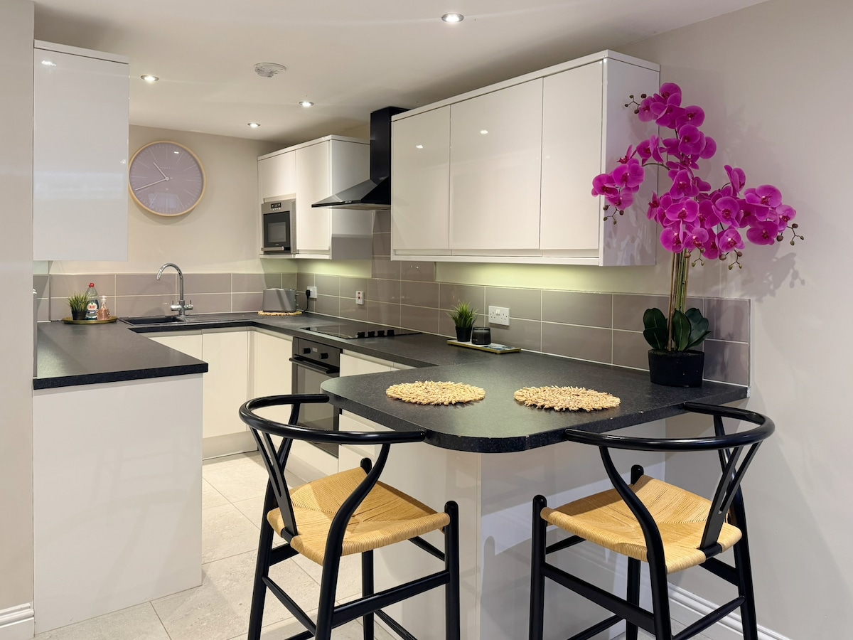 Our Cabin offers a cosy independent stay with a fully equipped kitchen, lounge, bedroom with super-king bed, luxury en-suite shower and utility with additional toilet. This eco friendly home has air sourced underfloor heating throughout and contains many upcycled items from the exterior reclaimed scaffolding boards to the many repurposed gems to be found inside. Stepping outside there is a private south facing patio and garden with its own parking space, all just a leisurely walk from town.