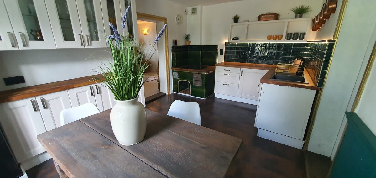This unique apartment occupies the attic of a historic building, which is part of the rural buildings. Guests have 80 sq m at their disposal with a separate entrance. The apartment includes a large living room with a children's corner, 2 bedrooms, a fully equipped kitchen, a dining room with a large table and a bathroom. Upon request, we provide a historic cellar where you can spend a pleasant evening by the fireplace and a glass of wine. Please let us know if you would like to use the basement after booking or upon arrival.