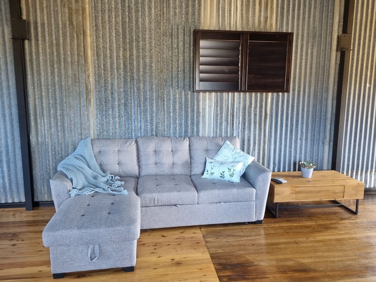 Fully self contained unit on rural acreage only 15 mins from centre of Tamworth. Off street parking. Located away from main residence so privacy ensured. Main bedroom has a walk in robe. Spacious lounge room. A double sofa bed. 65 inch smart TV in lounge with foxtel. Main bedroom has a 50 inch smart TV. All kitchen facilities and a BBQ. Sofa bed is fixed as of 31/3/24. Pets are not to be left unattended in cottage. Enjoy a complimentary bottle of wine and a couple of beers on arrival.
