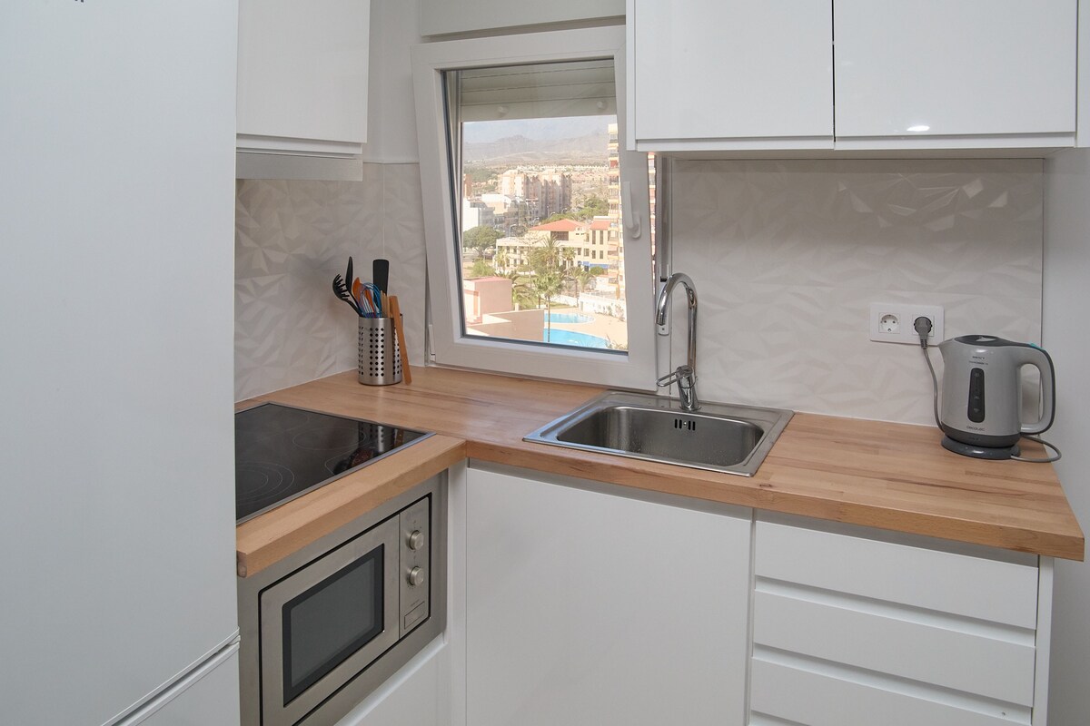 New Studio apartment in the best area from Los Cristianos, 12 minutes walking to the beach. Suitable for two persons and posible a baby. On the top fourth floor of a nice building with "elevator". It is well equipped and a nice terrace with nice views. Smart tv and the fastest Wiffi