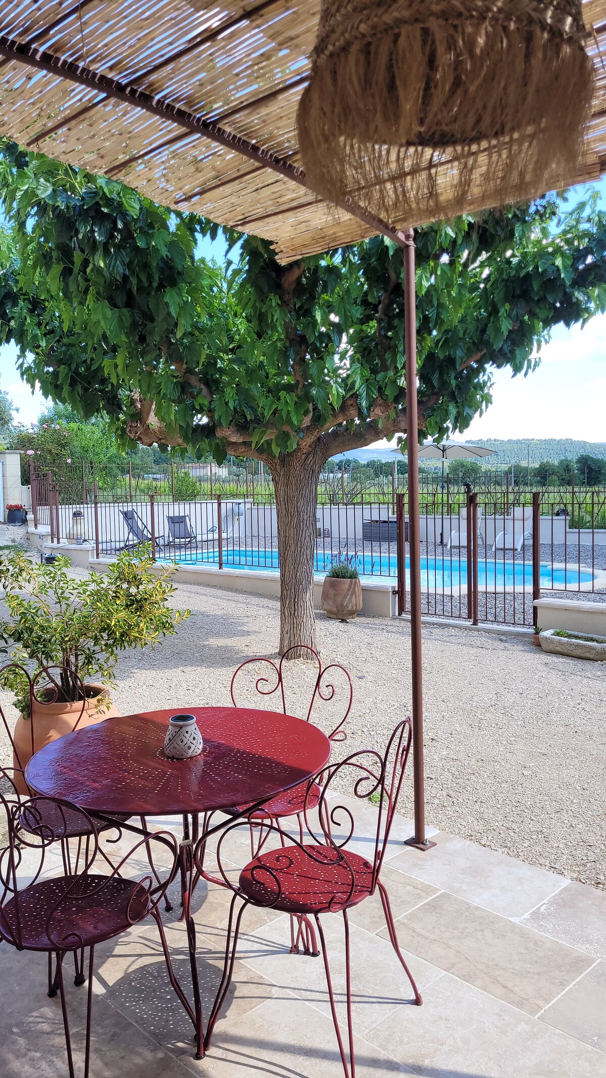 Independent apartment on the 1st floor in the countryside with a pretty shaded and fenced garden. Pleasant southwest facing terrace, 30 minutes from Avignon and Mont Ventoux. Not overlooked and beautiful unobstructed view. Extra child bed can be made available. Linens and towels not provided (160 x 200 bed) Cleaning is to be done by you at the end of your stay. 2 nights minimum booking