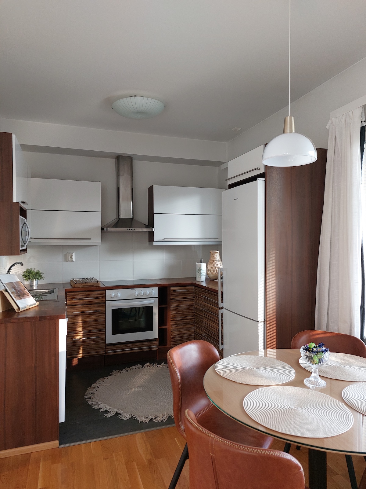 Winter Dream Suite – Luxury and Relaxation Near the City Center This high-quality and spotless apartment accommodates up to four guests and features a private sauna and a cozy balcony. The location is perfect: a peaceful setting ensures restful nights, yet the city center with its services and attractions is just a short walk away. Scandinavian style 2nd floor apartment has a large living room, alcove with queen size bed, sauna and furnished balcony. Fully equipped kitchen.