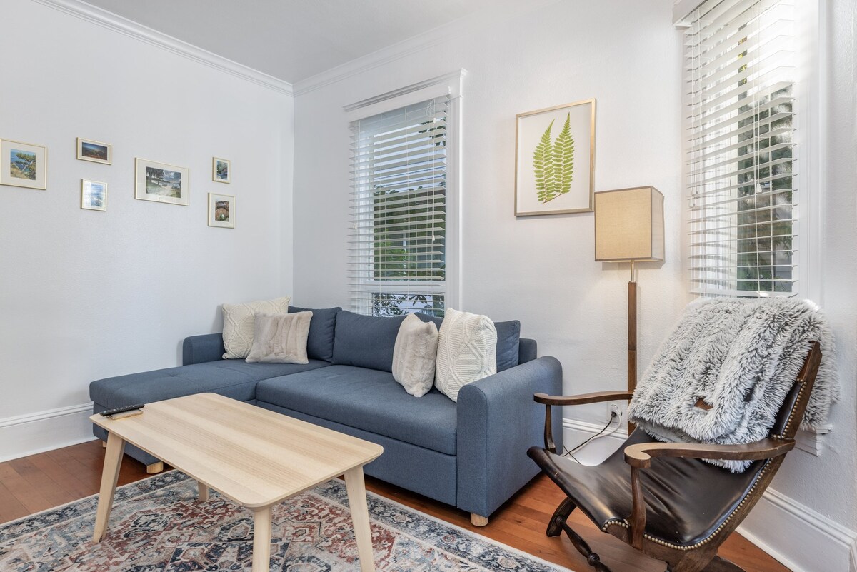 Huge private top floor 1 bedroom/den apartment from home’s side stairs. 950 sq ft newly remodeled on historic landmark street. Top of hill… 2 LEVEL walking blocks to 40+ restaurants, bars, retail, grocers. Decorated with curated art, cook’s kitchen, den with daybed, laundry, expansive view balcony. Vaulted ceilings/sunny rooms. New Casper mattress, luxury Brooklinen sheets. Fast WiFi, Samsung TV/Bose soundbar with cable/streaming. N.W. travel library. AC! 2 buses 2 blocks. Free Parking
