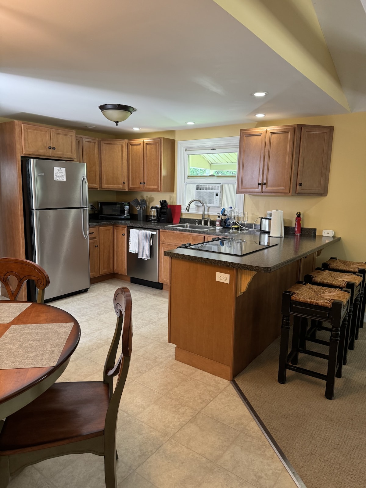 Nestled in the quiet woods just north of Mt. Monadnock our cozy one bedroom apartment invites the outdoors in with peeks of the mountain through the trees. Sit out on your private deck and enjoy the view or stroll around the yard and pick a few blueberries in season. We welcome hikers, nature lovers, those visiting friends or family or just wanting to enjoy the area's beautiful scenery and many artistic venues. I like to think of it as a peaceful sanctuary that we'd like to share with you.