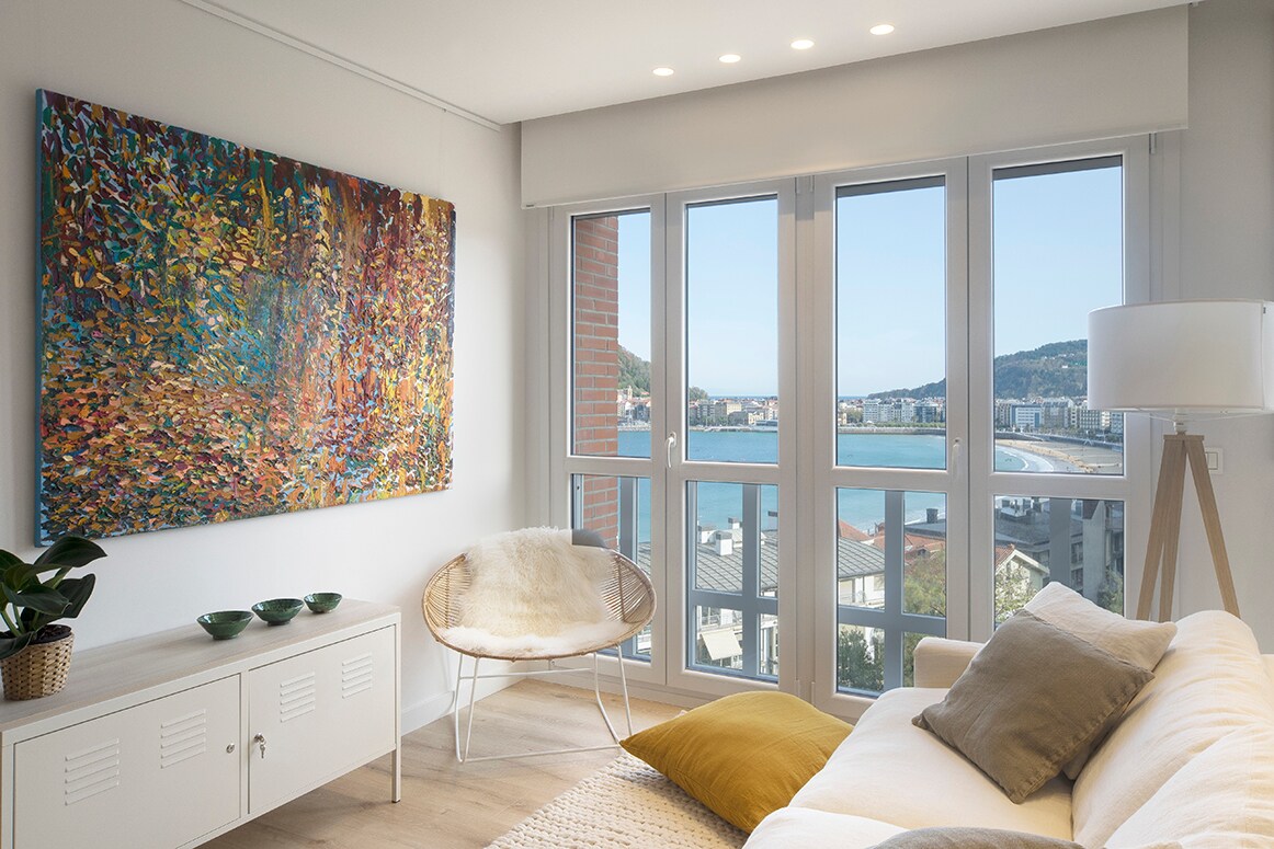 Cozy and cheerful apartment full of color and light to enjoy San Sebastian. Panoramic Sea views. Perfect dimensions. A few steps from the beach of La Concha and the city center. Divided into a spacious room with good closets, a spacious living room with a super comfortable sofa and modern paintings, an open kitchen with all the necessary appliances and top brands. Large bathroom, large shower, office space for the washing machine and the hot water heater. HIGH SPEED WIFI and BEO Sound Speakers.