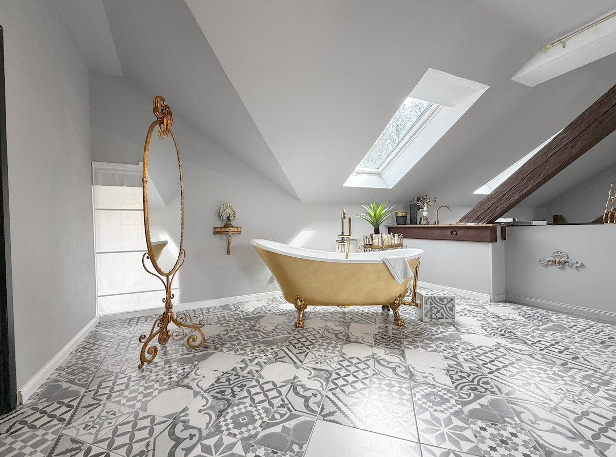 *Your time out in the castle overlooking an old English garden and sauna* This bright apartment with special interior design and high-quality furnishings is located in an outbuilding of the former baroque Louisenthal Palace. Spacious eat-in kitchen, modern bathroom with rain shower, sauna, bedroom overlooking the valley, a grand piano and turntable for musical hours, countless opportunities for activities in the surrounding area - A dream apartment to switch off & feel good!
