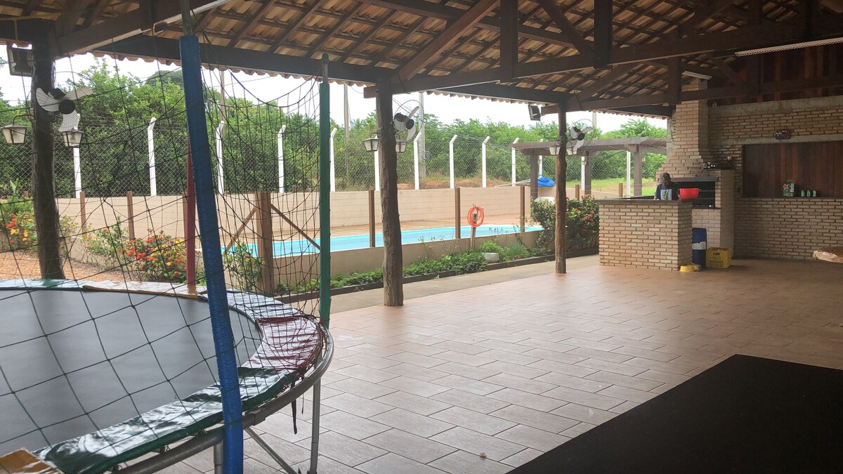Have fun with the whole family at this stylish place. With a bedroom with a queen-size bed and another auxiliary queen-size bed, air-conditioning and a fully decorated environment with all bedroom and kitchen utensils, refrigerator, freezer and Cooktop, wood-burning stove, wood-burning oven and pizza oven, as well as a beautiful barbecue area, solar heated swimming pool, with waterfall.