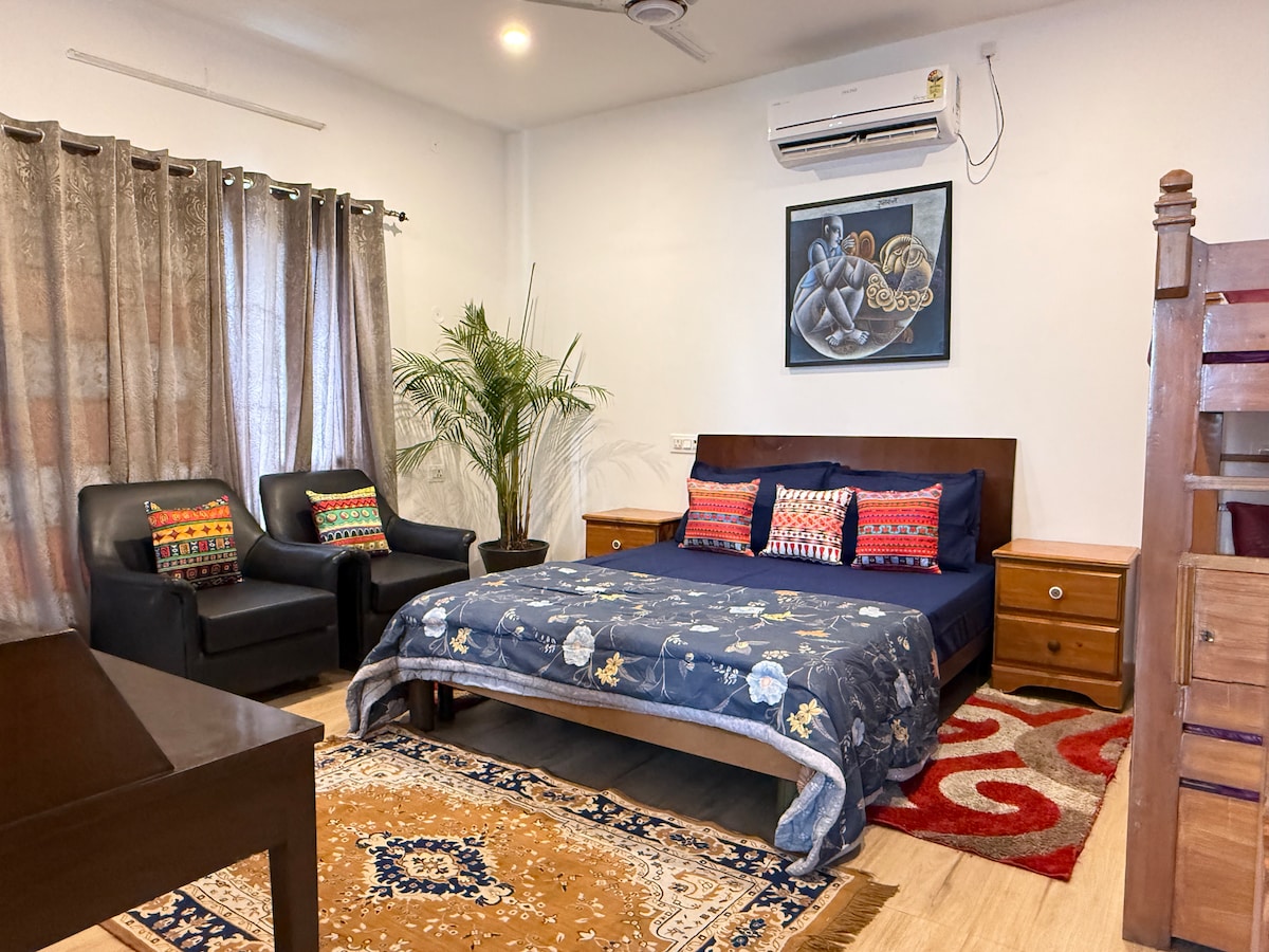 Welcome to our 1bhk situated on the 1st floor - Ideal for solo travellers or small families. This apartment features a comfortable bedroom, a fully equipped kitchen with all the basic amenities, and an attached bathroom for your convenience. Step outside onto your private balcony and enjoy a peaceful forest view - perfect spot to unwind with a cup of coffee or simply relax in nature. Whether you're here for a weekend or an extended stay, we ensure a comfortable space for all your needs.