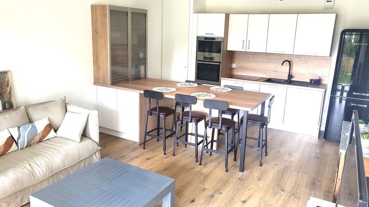 Ideally located in a quiet area, 10 minutes from the port and the historic heart, 5 minutes from the train station and major highways, independent accommodation in a house in Saint-Avé. Whether you are alone, as a couple or with family (cozy for 3 adults or 2 adults and 2 children) to discover the charm of the Gulf of Morbihan, its islands, beaches and hiking trails but also for business or training, we will be delighted to welcome you in this recently transformed 34 m² 2-room apartment. Fast Wi-Fi. Large private parking.