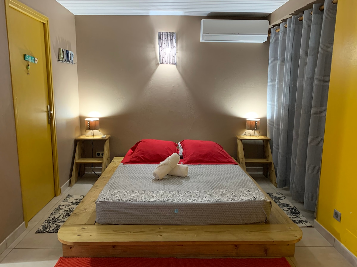 Le Ti Palmier Rouge was designed for lovers. Built in the middle of an orchard opposite the islets of Le François, this 40m2 space is dedicated to peace and love. Coconut, guava, acerola, avocado, mango and carambola trees surround the wooden chalet. The kitchenette is on the terrace, so you can make the most of the view. The 2x2m outside pool is made of river stone and has a unique feel. The beautifully decorated bedroom is air-conditioned. Italian shower, mini dressing room, kitchen outside..