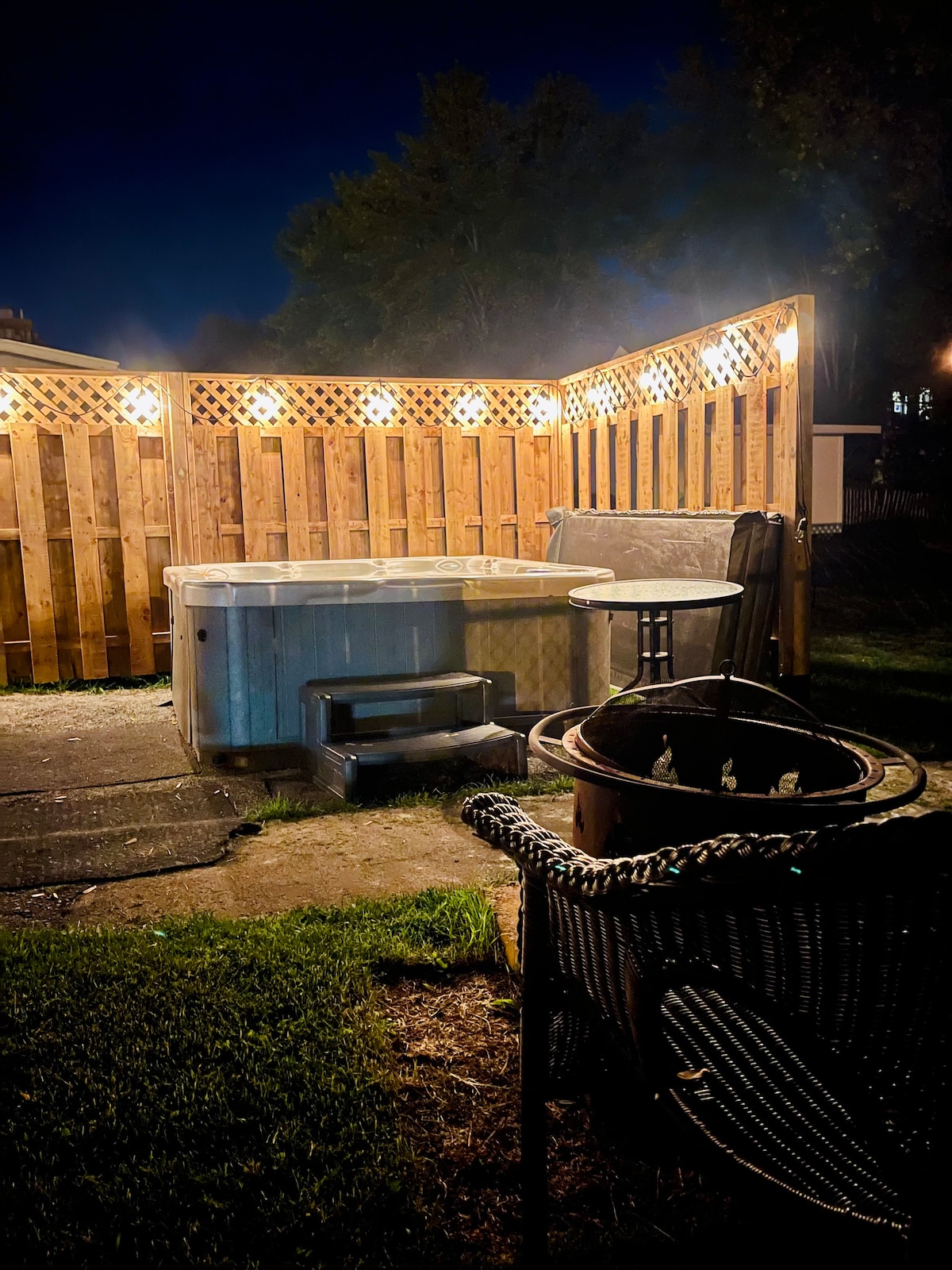 A bright, modern, one-level getaway in the quiet Sunnybrae area minutes from downtown. This fully-equipped and tastefully designed bungalow with luxury amenities is a peaceful retreat without being remote. Enjoy a movie with included streaming services or cable in the cozy living area. Or spend a relaxing evening in the hot tub surrounded by string lights before roasting s’mores over your choice of a wood or propane fire pit. Perfect for families, a park with splash pad is a 1min walk away.