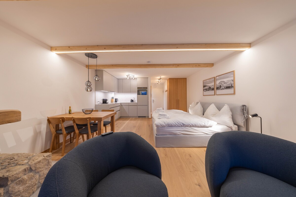 This Exclusive Studio for two guests is located on the second floor of Chesa Rosatsch, which was fully renovated by 2025. The studio itself was completed at the end of 2025, finished with great attention to detail and high-quality materials. From the apartment and its sunny balcony, you can enjoy peaceful views of the surrounding alpine landscape — an ideal place for relaxing moments, sunset aperitifs, or restful days in the mountains.