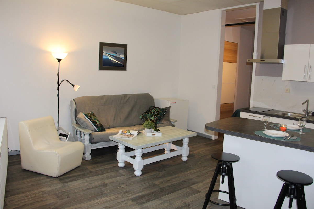 Kick back and relax in this calm, stylish space. This 60 m2 studio located on the 3rd floor of a new building is equipped with an equipped kitchen, shower, private sauna, balcony and fiber WiFi 10-minute walk to the center of Liège, 1-minute walk to Parc de la Boverie and its Museum, close to "La Médiacité" shopping center, close to Guillemins train station and all amenities Depending on availability, late checkout is possible for an extra €15/hour