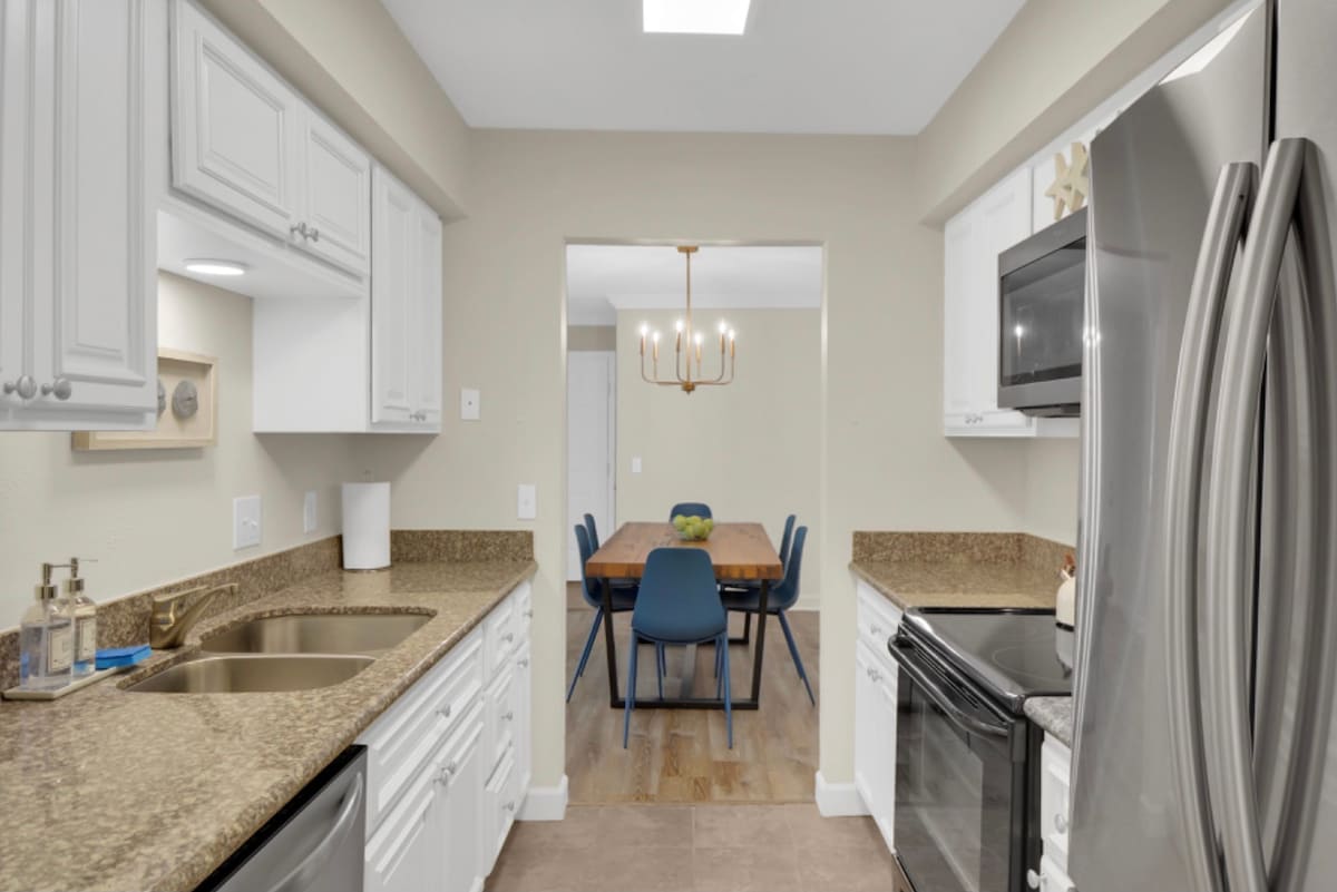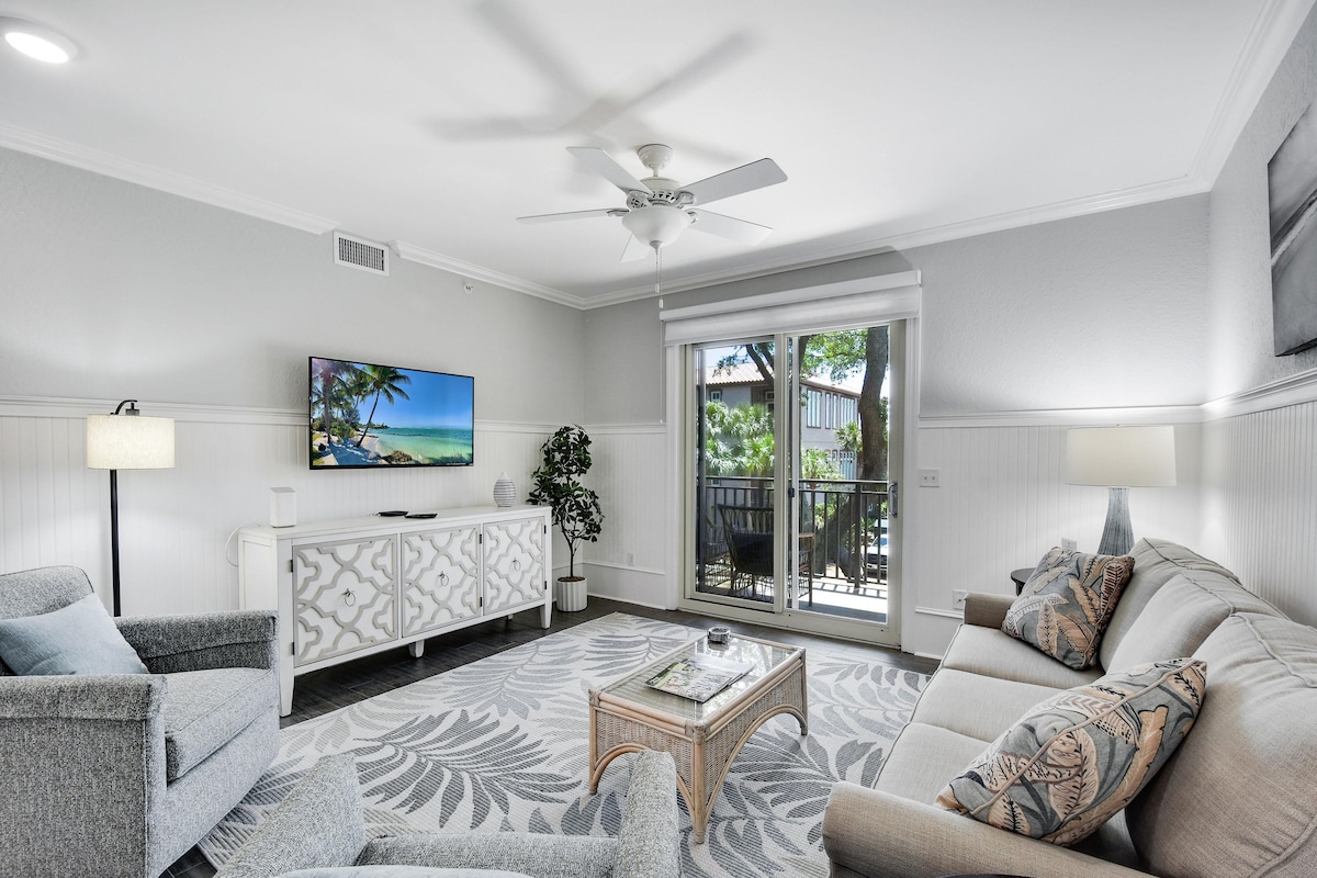 Completely Renovated! This newly furnished condo is a great place to come back to after exploring all St. Simons Island has to offer. Just a short 3 miles from the beach and village area, it's perfect for a small family or couple. The condo has private parking and a great community pool. Enjoy a cocktail on the private deck while you make dinner on the grill! A Smart Home with Alexa in every room. You can have music in any room or the whole house, turn lights on and off by voice and more.