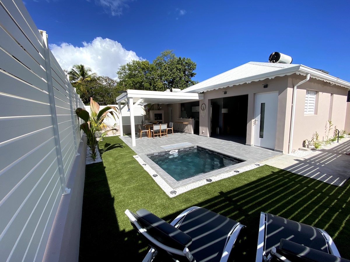 Imaginez-vous, main dans la main, sirotant les cocktails de bienvenue🍹au bord de votre piscine balnéo 💦, avec vue sur les bananiers. À 3 min de la plage à pied, la villa Makandja 1 vous attend, avec son jardin tropical … spacieuse, récente, moderne et totalement indépendante, elle vous promet une parenthèse inoubliable à deux 💑. A proximité, vous trouverez des plats à emporter et plusieurs restaurants. Entre Ste Anne et St François, un point de départ parfait pour découvrir l’archipel 🌴