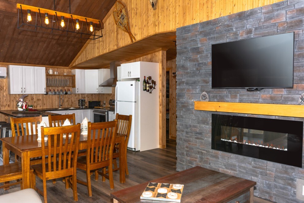 L'Étincelle, a magnificent tastefully decorated chalet will allow you to escape from your daily life. Bordered by a lake with calm waters, you can indulge in water sports, relax to the sound of birds and the lapping of the water. In the evening, admire the sunset on the lake and continue this beautiful adventure around an outdoor fire. When the temperature does not allow it, you can enjoy the large canopy, the splendid 4-sided fireplace or a game of pool inside.