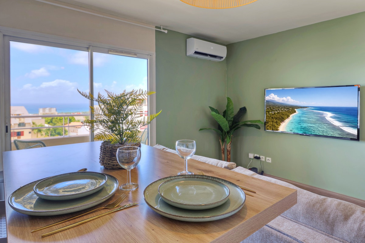 Overlooking the city of St Denis, 15 min drive from the airport, 3 min walk from the cable car terminal, this cozy apartment (40 m² + 12 m² outdoor) will be your ideal starting point to explore the island. Climb the few turns to reach the apartment and come enjoy its comfortable terrace as well as its magnificent panoramic ocean views. A vacation as if you were really at home but at the end of the world!