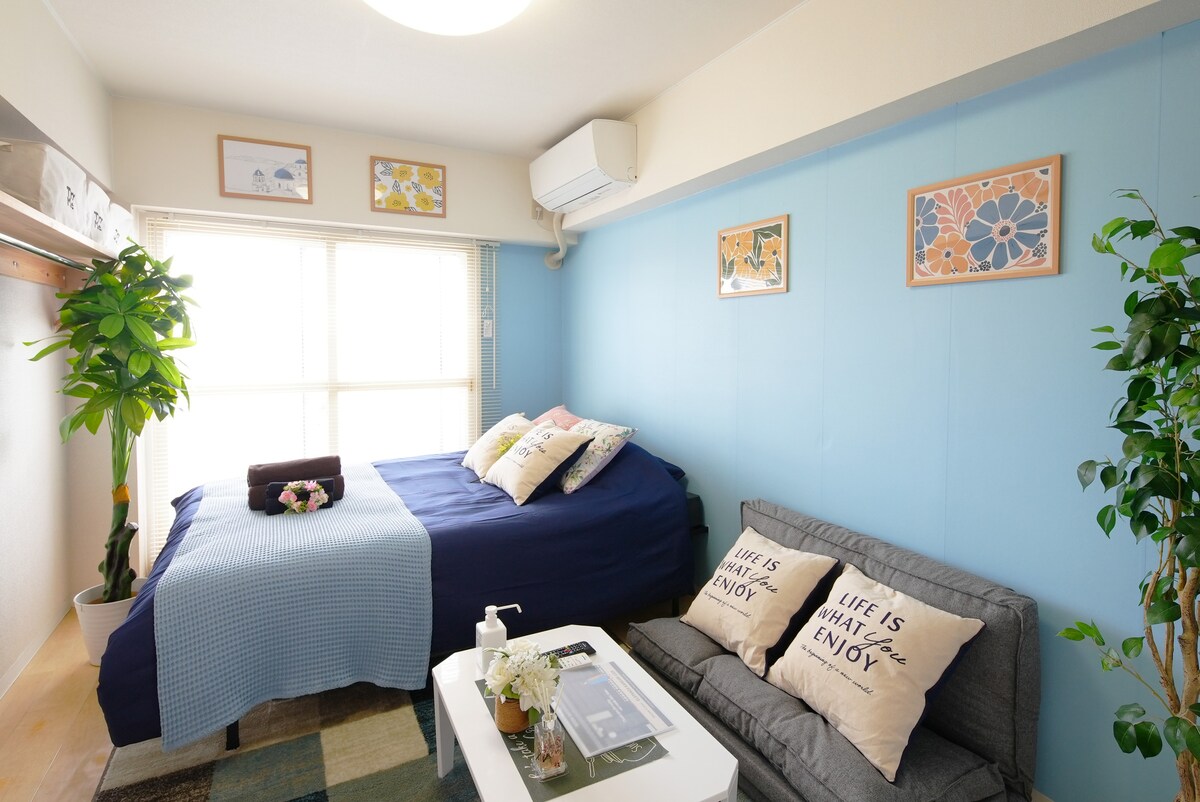 Just a 2-minute walk from the station, Palette House is a cozy and stylish retreat perfect for exploring Tokyo. The industrial-style kitchen includes an island bar, full cookware, wine glasses, and a water dispenser—ideal for cooking and evening drinks. The living room features natural driftwood décor and a comfy sofa, while the Japanese-modern bedroom offers a refined, relaxing space. With thoughtful amenities and warm design, it’s a perfect base for couples and families.