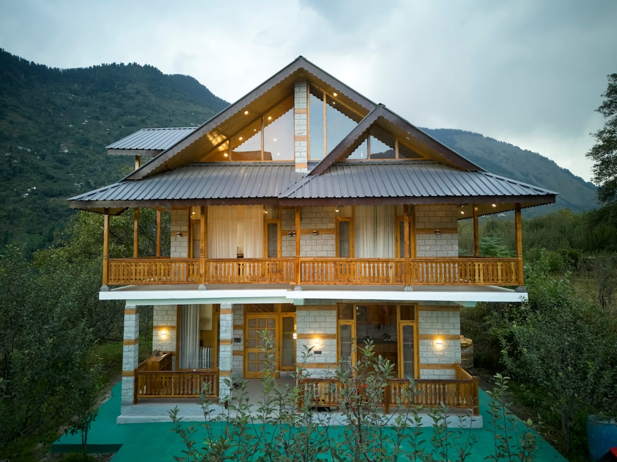 Proudly featured in "Travel + Leisure Asia" as one of India’s best Airbnbs with a fireplace. Whistling Thrush Villa is a serene 3-bedroom retreat nestled in a lush apple orchard in Naggar (30 mins from Manali). Wake up to birdsong and panoramic mountain views. Thoughtfully designed interiors blend Himachali charm with modern comfort — perfect for slow mornings, bonfires, and quiet luxury in nature. On-site Professional Chef - Meal service available on request