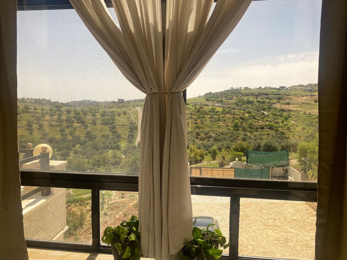 Relax in a modern home surrounded by Ajloun’s forests and mountains Wake up to panoramic views from two spacious balconies. early morning you can see Alshiekh landscapes in lebanon & Nablis in Palestine, enjoy a peaceful garden with fruit trees, and gather with friends around the outdoor seating and BBQ area. The house sleeps up to six, with a fully equipped kitchen, cozy living room, and comfortable bedrooms. Perfect for families, couples, or anyone looking for a private retreat close to nature