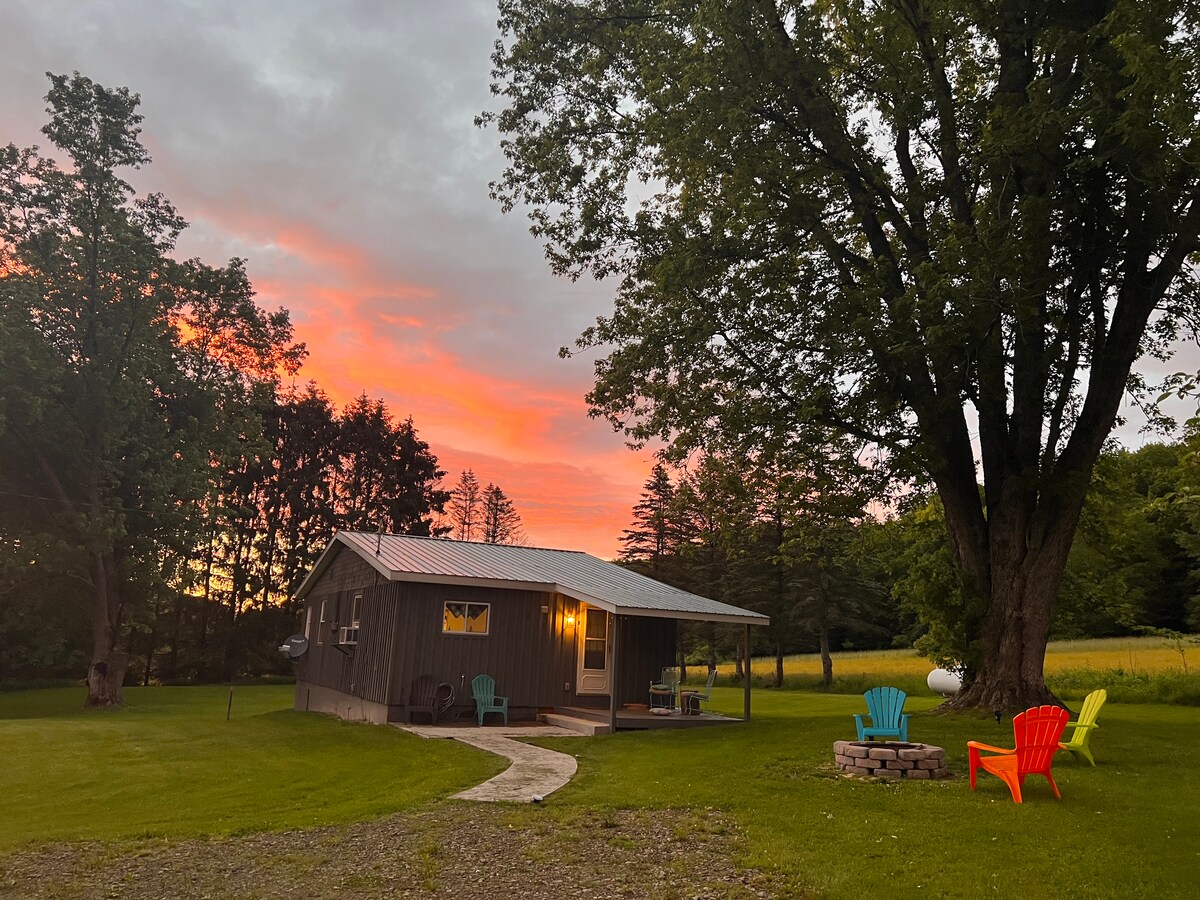 Family built cabin on 30 acre country estate, just outside exciting year round resort village of Ellicottville. Perfect for nature lovers and outdoor enthusiasts, the cabin has all necessities, similar to a tiny house. Nestled near the gardens, and surrounded by quiet rolling hills. Enjoy with door step delivered breakfast, or book a guided hike with estate owner and learn about medicinal plants and flowers, the topography of the land and a farm fresh picnic lunch on the peninsula of our lake.