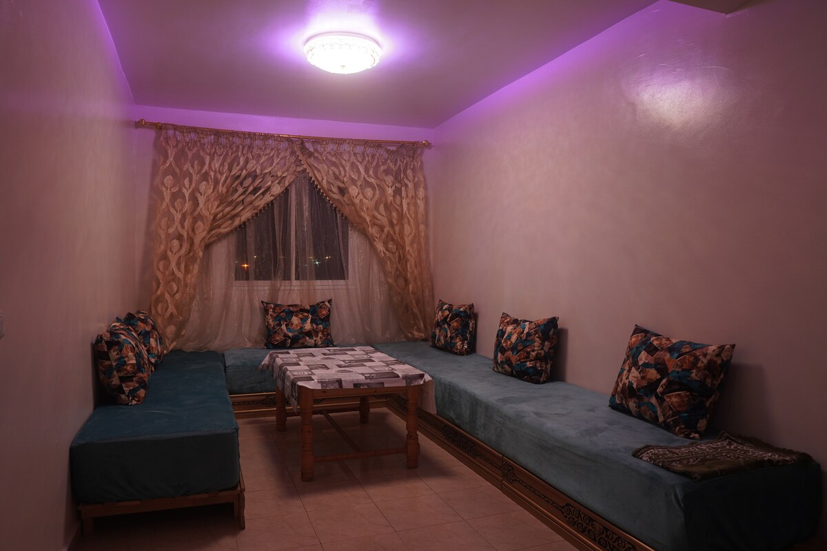 Discover this modern and peaceful accommodation in the heart of Salé, a few minutes' walk from Salé-Tabriquet train station, the tram, shops and all amenities. 👉 Direct train to Rabat Hay Riad, convenient to reach the stadium during the CAN. 🛏️ Two comfortable bedrooms + spacious living room with 43" Smart TV, Netflix, IPTV and high-speed fiber optics. ❄️ Air conditioning available as an option. 🍽️ Fully equipped kitchen. 📍 Perfect for visitors and CAN supporters.