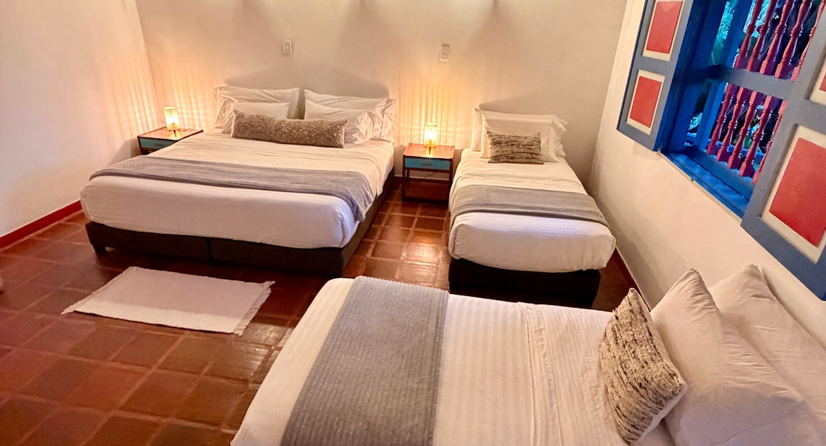 Located in a house with more than 180 years of history, Amaruka is a unique space for rest and connection. Here you will find cozy rooms, à la carte breakfasts, a coffee shop, bar, art and antiques, massages, and spaces for yoga and meditation. Immerse yourself in the magic of nature, wellness, and history in a place designed to renew body and soul. Your refuge in Salento at Amaruka awaits you. Wayra Room (Wind) are 2 rooms separated by a curtain