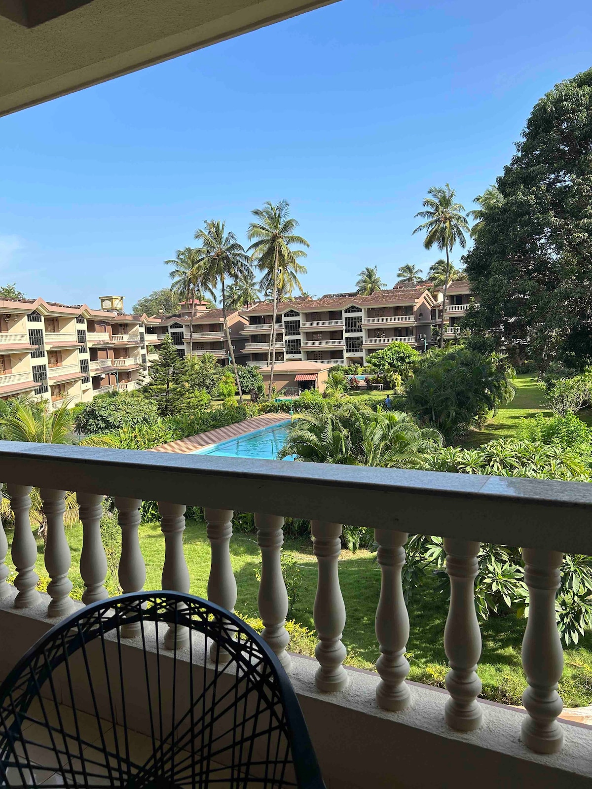 Royally designed Cozy 2 BHK apartment with Poolview Balconies in the most popular society of Anjuna Vagator. It's a well-lit & completely furnished flat with Fast Wifi & functional kitchen. Each room has AC, pool facing balcony. The society has 24/7 security with CCTV cameras. Situated within 1 km to the Anjuna and Vagator beach. Food trucks, Supermarket and shops are outer side the society. Very close to famous restaurants, clubs, and Bars. Sunburn Festival is within walking distance.